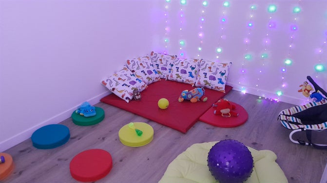 Deux espaces spécifiques permettent aux tout-petits de s'épanouir et découvrir leur 5 sens grâce à des jeux de lumière; des dalles sensorielles; piscine à balle; parcours avec des modules souples de motricité; éveil musical .....